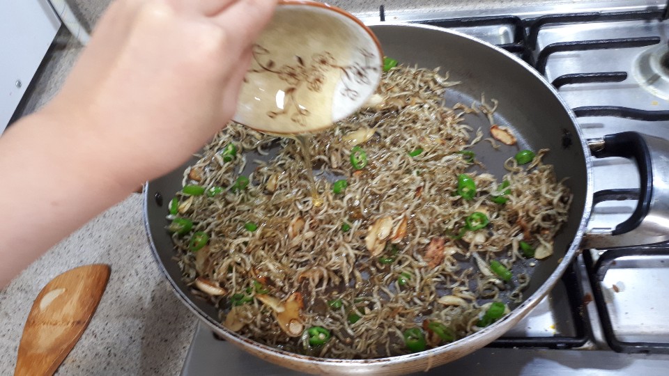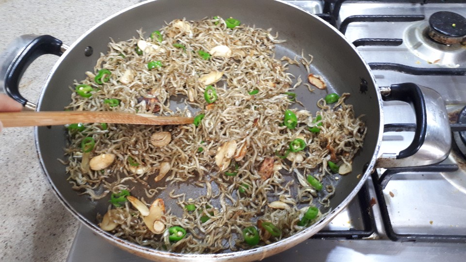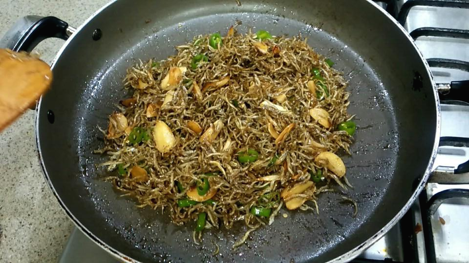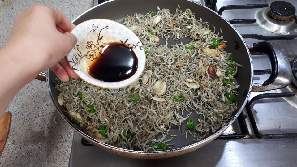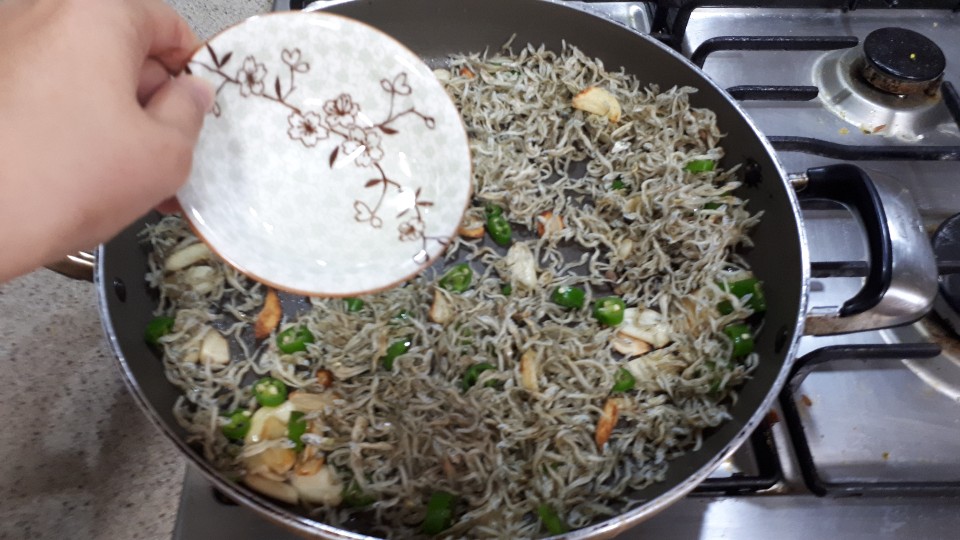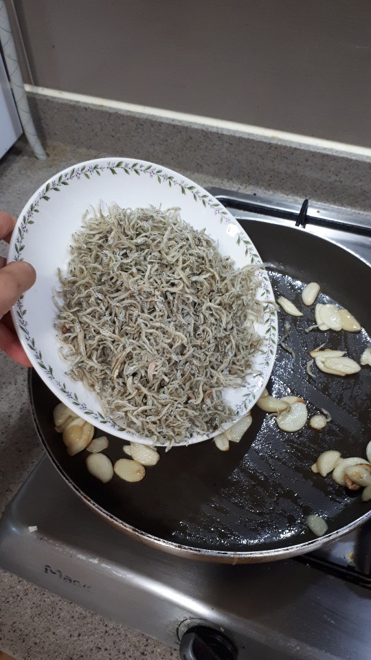 4. 마늘이 노릇하게 구워졌으면 준비된 멸치를 넣어주세요~