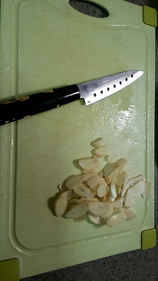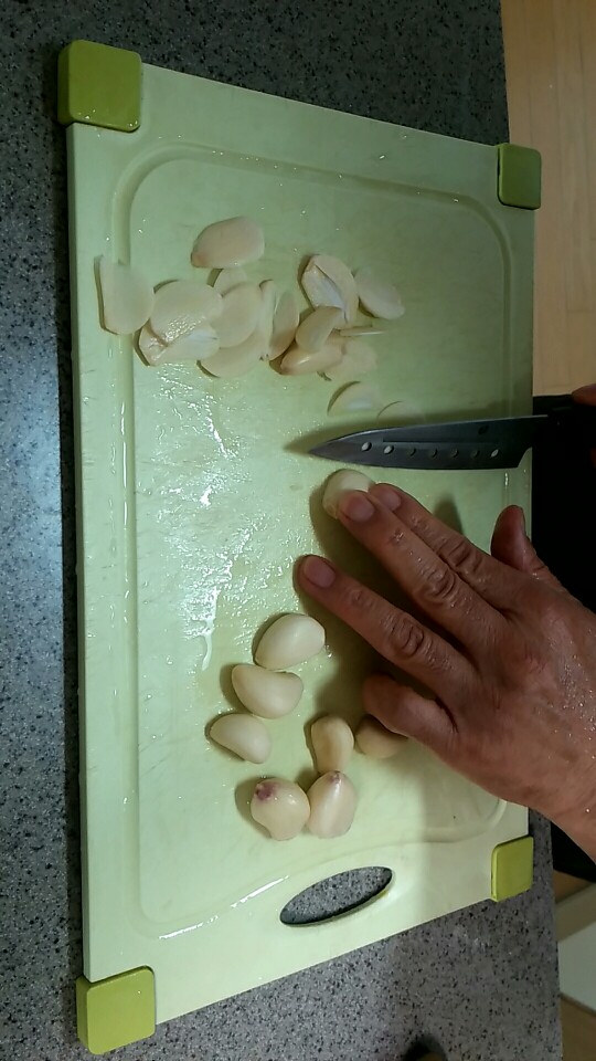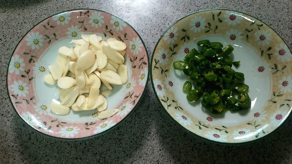 1. 마늘을 편쓸기를 해주시고, 청양고추도 송송 썰어주세요.