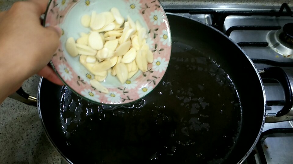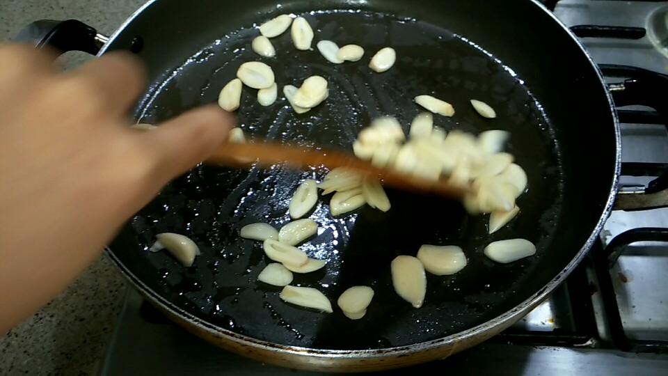 2. 살짝달군 프라이팬에 기름을 충분히 두르고 마늘을 넣어주세요.